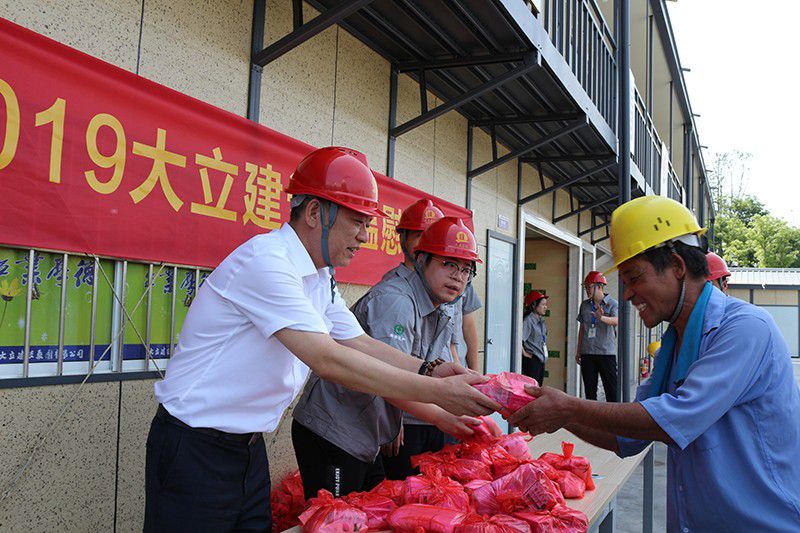 美丽的杭州已进入高温期,大立建设集团如期开展2019年高温慰问活动。7月24日大立建设集团董事长傅宝剑、副总经理傅徐超、工程部经理赵忠有等一行来到钱江世纪城世纪一、二苑工地,为高温下坚守岗位的广大工作者们送上防暑降温用品。董事长亲自将防暑降温用品送到每位工人的手中,向在酷暑中坚守工作岗位的工人表示亲切的慰问和诚挚的感谢,并连声说:“你们辛苦了,你们辛苦了”。